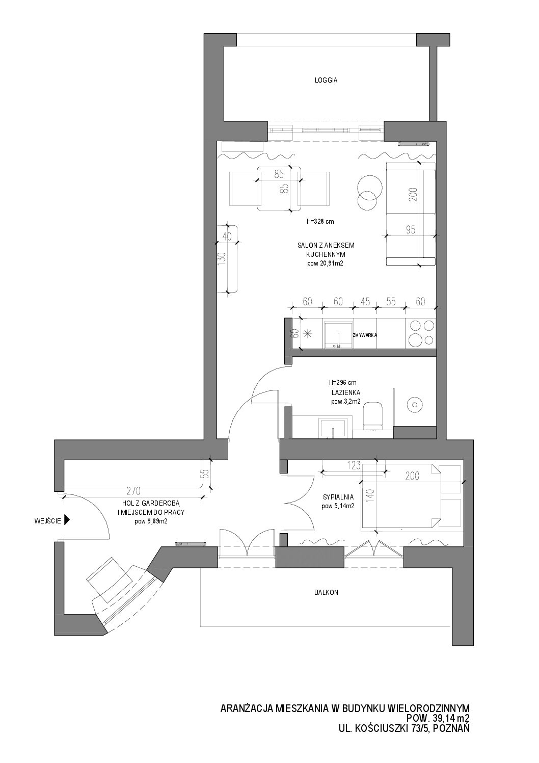 Powierzchnia mieszkania to 39,14 m2, na którą składa się salon z aneksem kuchennym, sypialnia, łazienka oraz hol z miejscem do pracy lub nauki oraz na dużą garderobę.